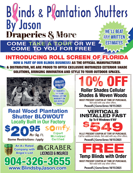 Blinds & Plantation Shutters By Jason specializes in high-quality custom window treatments including plantation shutters, blinds, shades, and draperies. Locally built and professionally installed, their products are designed to enhance both style and functionality for homes throughout Northeast Florida.