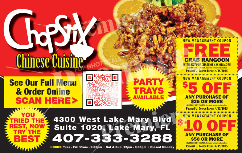 ChopStix Chinese Cuisine in Lake Mary has become a local favorite for its delicious, made-to-order Chinese dishes crafted with fresh ingredients and bold flavors. Whether you crave traditional favorites like General Tso’s Chicken or modern specialties, ChopStix delivers generous portions with authentic taste in every bite.