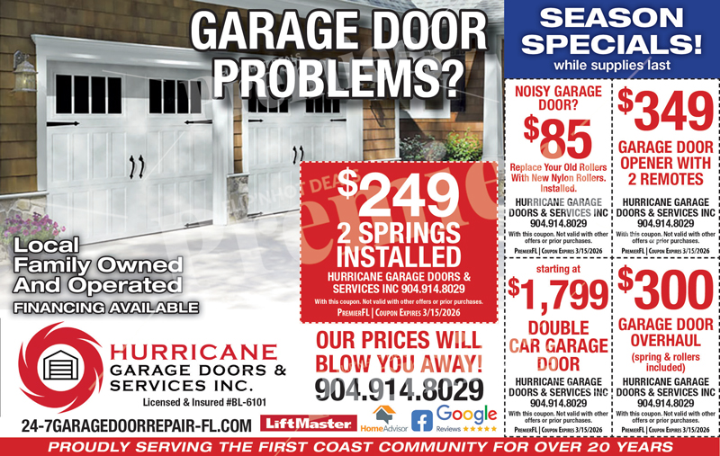 Hurricane Garage Doors & Services provides professional garage door repair, replacement, and installation services for homeowners throughout the First Coast. As a local, family owned and operated company, they are known for dependable service, competitive pricing, and long-lasting results.