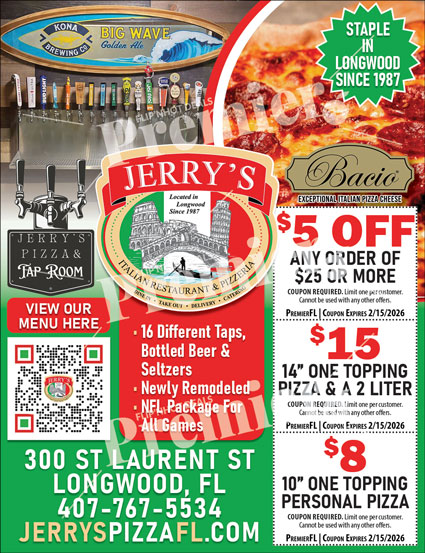 Located on St. Laurent Street in Longwood, Jerry’s Pizza & Tap Room is a go-to destination for locals looking for great food, cold drinks, and a comfortable place to unwind. Whether dining in, grabbing takeout, or meeting friends for a game, Jerry’s delivers a dependable, enjoyable experience.