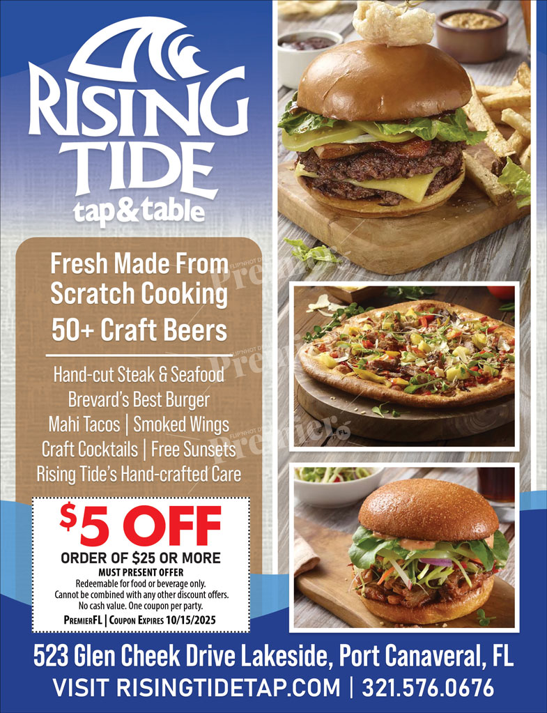 With its open-air design and waterside seating, Rising Tide offers the perfect setting to unwind. Sip a cocktail while watching the sunset over Port Canaveral or gather with friends for a weekend meal filled with laughter and live energy. The restaurant’s friendly staff, local brews, and welcoming atmosphere make it a top dining destination on Florida’s Space Coast.
