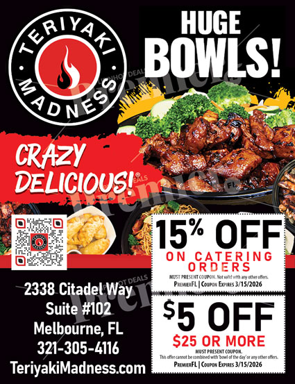 Teriyaki Madness in Melbourne, Florida serves bold, flavorful Japanese-inspired cuisine with a fast-casual twist. Known for its generous portions and freshly prepared ingredients, this popular spot offers made-to-order teriyaki bowls packed with grilled meats, fresh vegetables, and signature sauces. Whether you’re dining in, ordering takeout, or catering for an event, Teriyaki Madness delivers a satisfying and convenient meal experience.