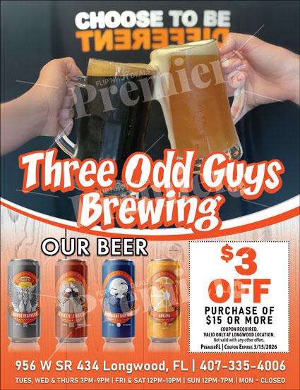 Conveniently located on West State Road 434 in Longwood, Three Odd Guys Brewing is a must-visit destination for craft beer lovers in the area. With consistent quality, rotating selections, and a welcoming atmosphere, it’s a go-to spot for anyone searching for great local beer.